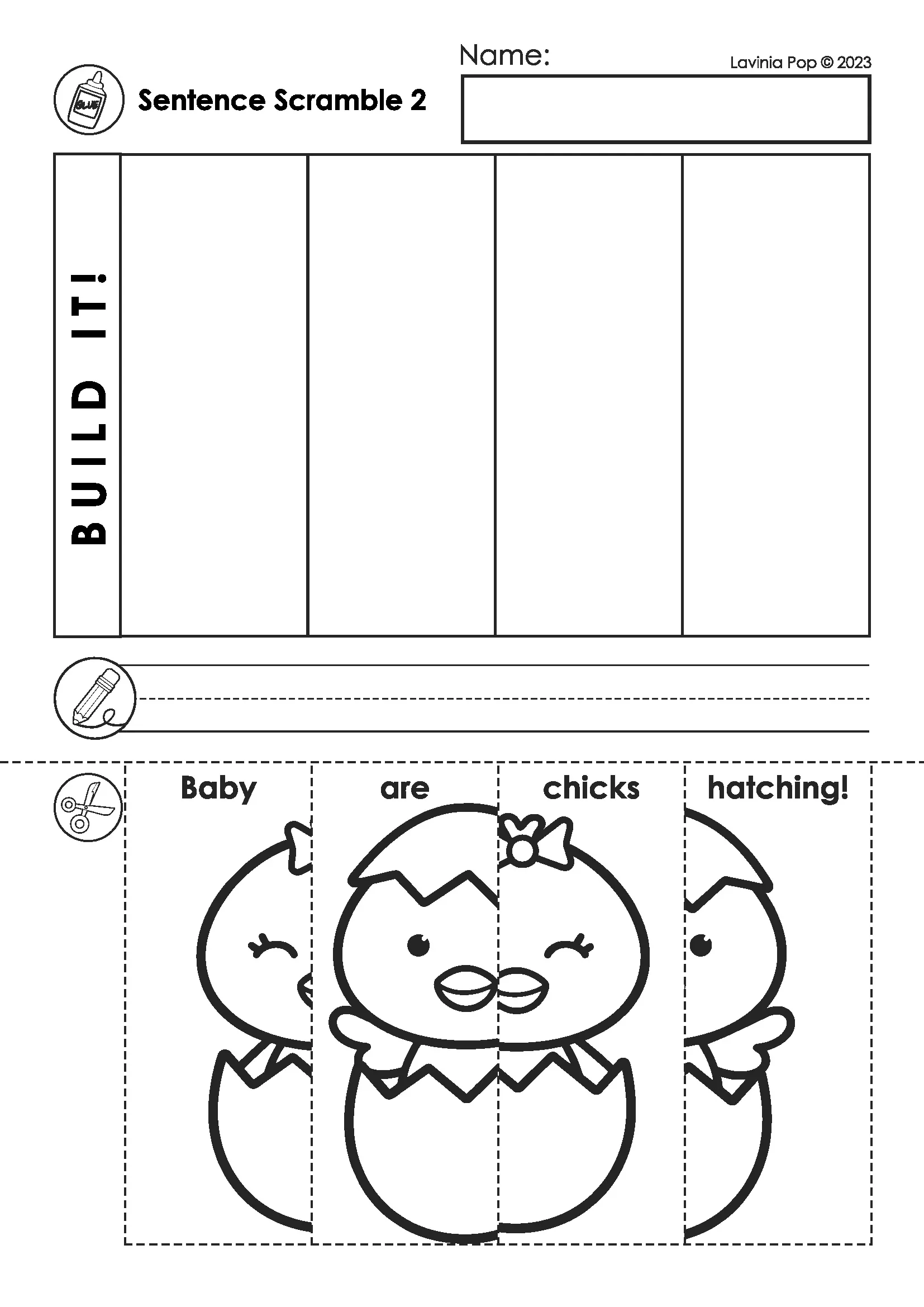 Once the sentence is correct, students glue the pieces into the boxes on the page. Finally, they write the completed sentence on the writing line.